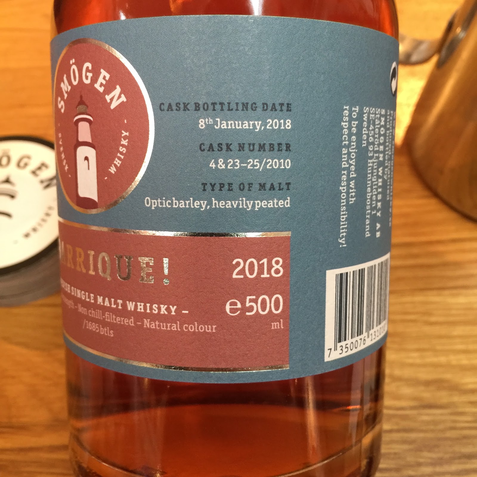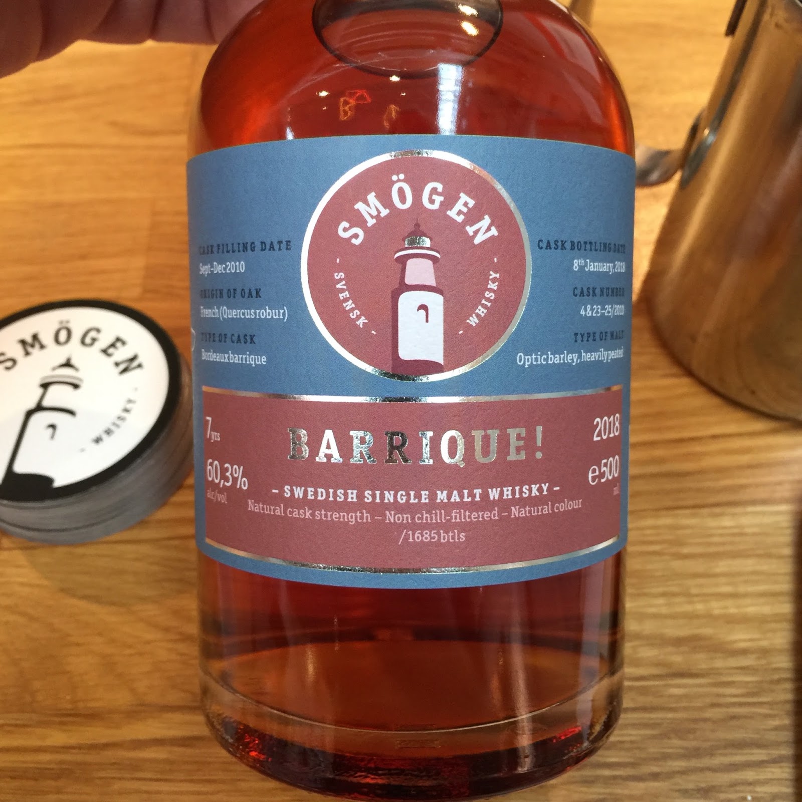 Barrique consists of a vatting of four european (french) barriques (225 litre casks) that has previously matured Bordeaux-wine. The casks used are number 4, 23, 24, and 25. The casks were filled with newmake starting in september 2010 ranging through to december 2010. The whisky was bottled at 60,3% ABV (natural cask strength) on the 8th of january 2018 making the whisky 7 years old. The (officially) oldest whisky from Smögen Distillery so far. The casks gave 1685 bottles out of which 1320 are available via the web launch.