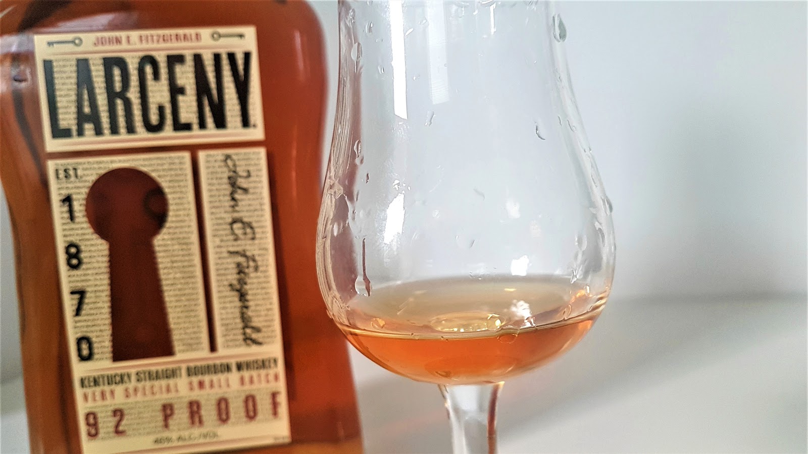 Att hylla gamla för länge sedan hädangångna gubbar som haft någonting med whisky att göra är populärt i branschen och det är väl egentligen inte så konstigt för det är ju så att en bra historia säljer, hur äktheten i den än är skruvad. Hur hög sanningshalten är i berättelsen om John E. Fitzgerald vet jag inte men en sak verkar dom flesta överens om idag och det är att han själv aldrig framställde någon whiskey men däremot hade näsa för god Bourbon. Han var tydligen skattmas, älskade whiskey och fungerade även som någon slags väktare eftersom han var den som hade nycklarna till dom bästa lagerhusen i området och då med andra ord kunde få tag i hur mycket whiskey som helst. (Se nycklarna på flaskans etikett) Receptet till denna whiskey går tillbaka till 1880-talet då den gick under namnet Old Fitzgerald och har därefter bytt ägare ett antal gånger. Nu ägs varumärket av Heaven Hill Distilleries och är döpt till Larceny och produceras på Bernheim Distillery i Louisville / Kentucky. Larceny är ett ord som betyder "att ta någonting från någon annan för egen del" och det har väl antagligen att göra med gubben Fitzgerald som verkade haft lite svårt med att hålla fingrarna borta från whiskeyfaten han ansvarade för. Whiskeyn är en så kallad Wheated Bourbon, vilket innebär att den största procenten i drycken förutom majs är just vete och fördelningen i whiskeyn är 75% majs, 20% vete och 5% korn. Man känner att detta är en Bourbon på doften, banan och nötter, sötma med karamelltoner och med en fyllig smak som möblerar hela utrymmet i gomen, honung och karamell och örtrik och lite pepprig i den långa eftersmaken. En riktigt bra whiskey med en muskelstyrka på 46% och som just nu går att få tag på här hemma för 549 kr i Bolagets beställningssortiment.