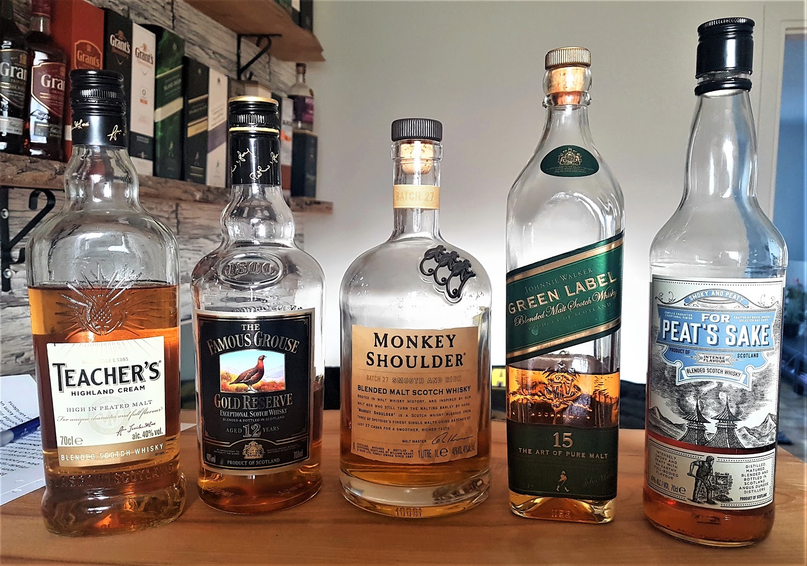Denna eftermiddag så samlades vi i SPF:s lokal i Vällingby för att tillsammans avhandla temat Blended Whisky. Vi hade tre klassiska whisky, en relativt ny och en som precis kommit ut på marknaden. I tur och ordning så gick vi igenom Teacher's Highland Cream Blended som ju är en whisky som nu har hängt med sen den senare delen av 1800-talet. Vi fortsatte med märket som är skottarnas egen favorit The Famous Grouse 12yo Gold Reserve som är ett klassiskt märke även om just denna variant är av något nyare slag. Världens första trippel malt, Monkey Shoulder Blended Malt som endast innehåller malt whisky från Glenfiddich, Balvenie och Kininvie i sin blandning och sen så fortsatte vi på ämnet blended malt och även klassiska märken med Johnnie Walker Green Label 15yo Blended Malt för att sen avsluta allting med den rökiga For Peat's Sake Blended Whisky som ju är företaget Angus Dundee Distillers hyllning till den överambitiösa destilleriarbetaren Mr Peat. Efter heta diskussioner så tyckte jag väl att dom flesta lutade åt Monkey Shoulder som den klart lysande med Famous 12-åriga variant som god tvåa men ingen av dom fem whisky som fanns i glasen gjorde någon besviken.