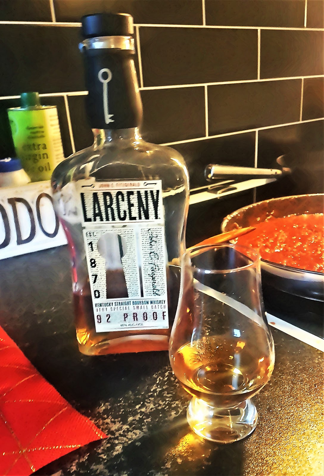 Medans marinaden till morgondagens revbensspjäll står och puttrar på spisen så har ansvarig köksklant, dvs jag själv hällt upp en John E Fitzgerald Larceny Kentucky Straight Bourbon som sällskap, vilken var en alldeles utmärkt fyllig och smakrik kompis bland slevar och andra köksredskap.