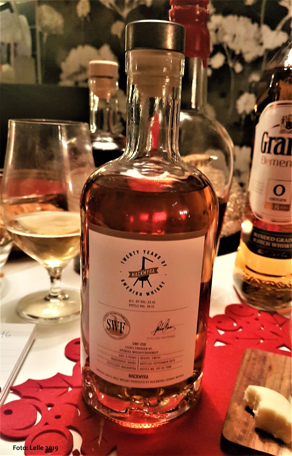 Den unika Mackmyra SWF 30# 6yo Cask Strength Single Malt med en styrka på 53,4% tog vi sen tag i. Whiskyn är en blandning av rökt malt som legat på ex Bourbonfat och orökt malt som legat på fat av ny svensk ek och denna finns endast i ett antal av 1000 flaskor.