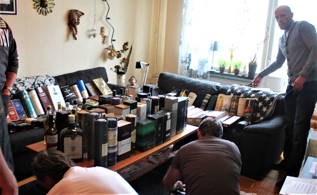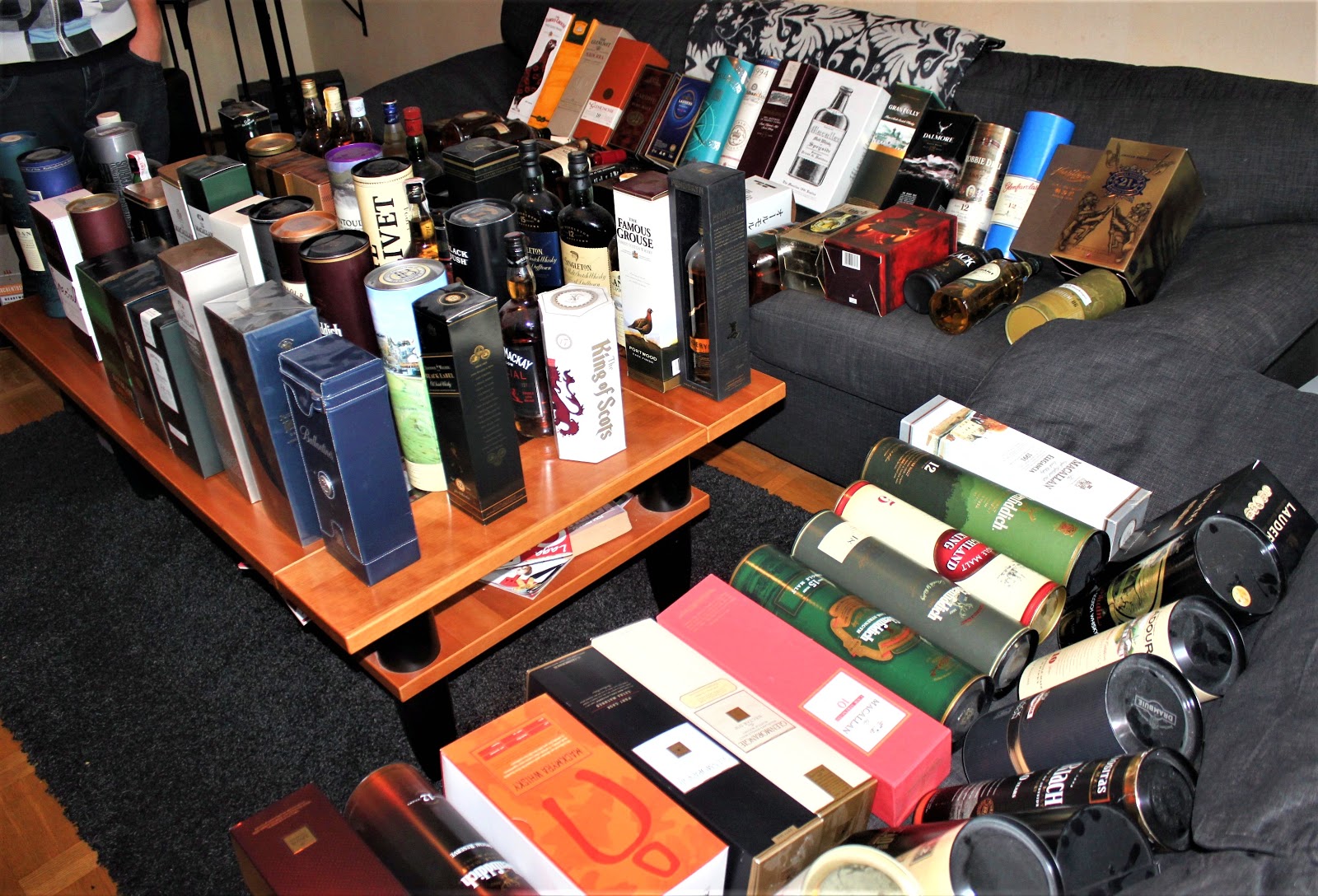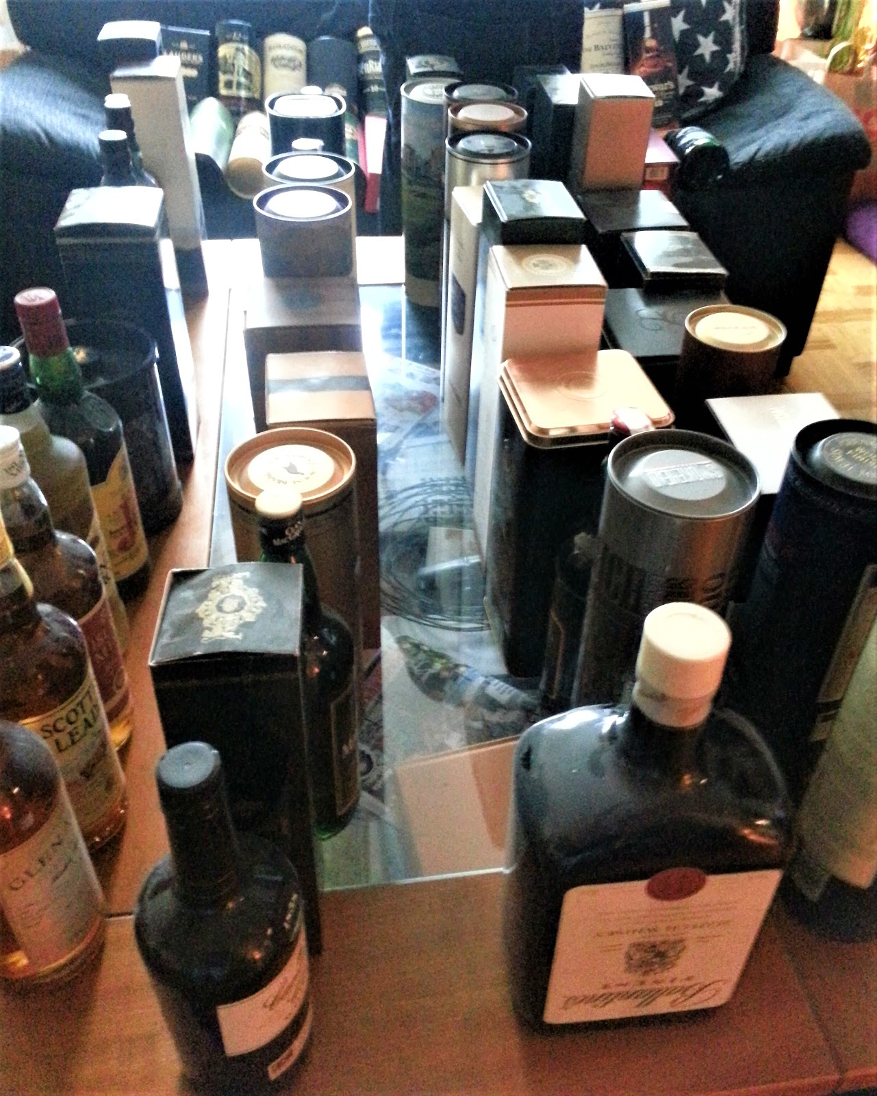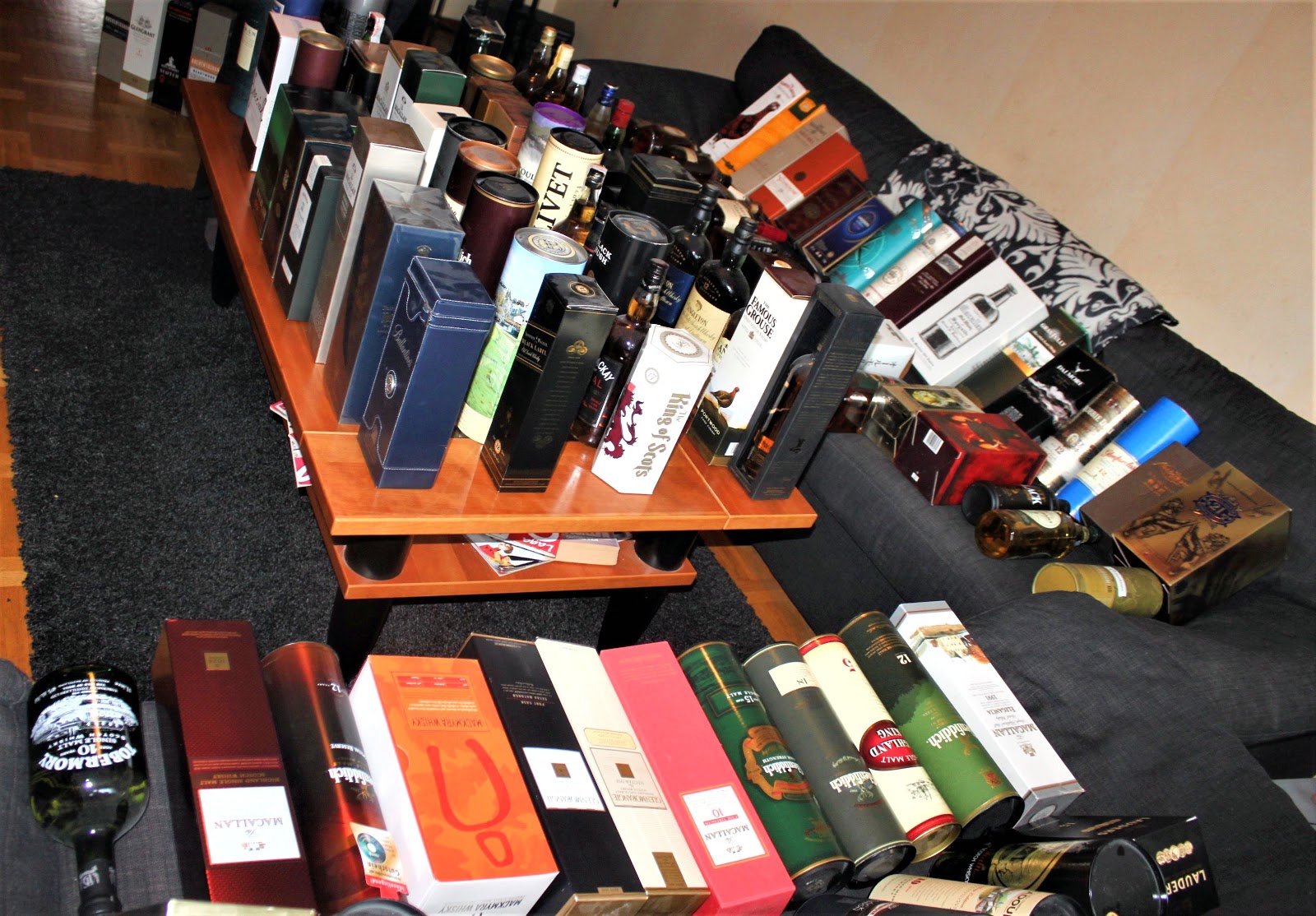 Nedanstående bilder är från mitt vardagsrum för några år sedan när vi i Whiskyklubben Boothie precis hade köpt upp 150 whisky av en samlare som beslutat sig för att ge upp whiskysamlandet och istället börja med Absolut Vodka. Om jag inte minns fel så fick vi efter en utlottning runt 13-15 flaskor per huvud och en del av dessa använde vi till kommande provningar.