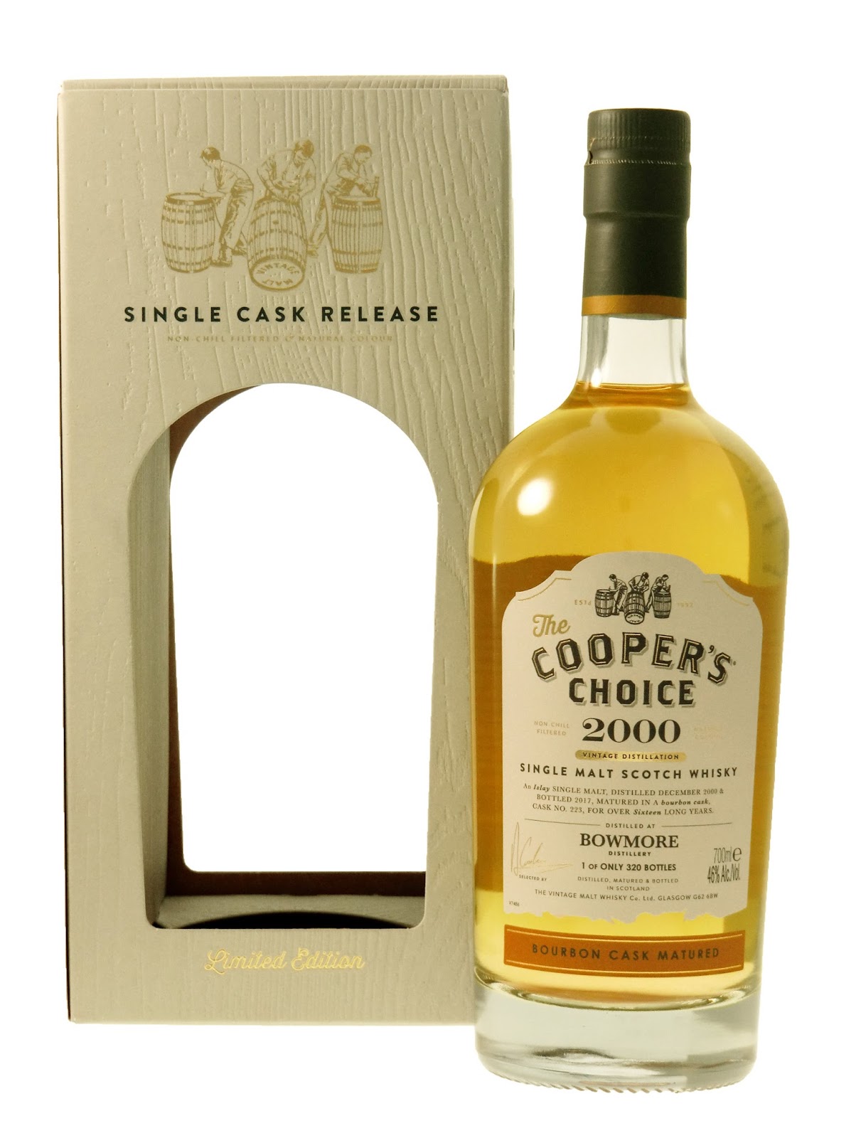 Hemma i Svea rike har jag nu haft möjlighet att prova på en somrig Bowmore whisky från Symposion i form av en Coppers Choise buteljering från det familjeägda bolaget och oberoende buteljeraren The Vintage Malt Whisky Company. Brian Crook som grundade bolaget 1992 har sedan innan en relation med just Bowmore då han arbetat där som deras Exportchef. Med detta i bagaget så finns en viss förväntan på att detta torde kunna vara en härlig historia. Det handlar i alla fall om en single cask utgåva numrerad 223, destillerad i december 2000, lagrad på bourbonfat och buteljerad 2017 med en alkoholvolym på 46 %. Färgenpå denna 16 åriga Bowmore 2000 upplever jag vara väldigt ljus, som en vit sandstrand med lite gula kornstänk i. Doften av söt torv möter nosen och en härlig maritim nyans av salt havsluft sveper förbi. Sen är det en utsökt fruktighet där som jag uppfattar som oerhört frisk, såsom krispig stjärnfrukt, röda vinbär och gula mosiga päron. Blommande viol finns med i doftbilden samt toner av jord, mossa och lav samt en hint av eukalyptusolja. Efter en stunds luftning utvecklas sötman och framträder som tuttifruttiströssel. I doften hittar jag även något som påminner om doften av gummi- och då menar jag den typen av luftmadrass i gummi då den är alldeles ny och oanvänd och just urplockad ur sin kartong. Smaken är söt som av ljus akaciahonung och härliga nyanser av vanilj är tydligt. Direkt upplever jag smaken som oerhört mild och timid men den växer liksom på sig med lite luftning. Med lite tid på sig försvinner blygsamheten och fram kommer en portion fruktighet från gröna päron, söt syrliga äpplen och mosig mango som varit nedfryst och blivit upptinad. Godissötma a´la zoopastiller och mjölkig vit choklad a´la kinderägg dyker upp och jag tycker mig nästan få effekten av ”krämigt” på tungan. En mintig kryddighet finns även med och mina tankar går åt den indiska yoghurtsåsen Raita med mynta och koriander. Den rökiga torven är förvånansvärt lätt i smak men växer till sig och framträder som intensivast i eftersmaken. I eftersmaken växer likaså smaken av cederolja fram samt att eken blir som tydligast då.