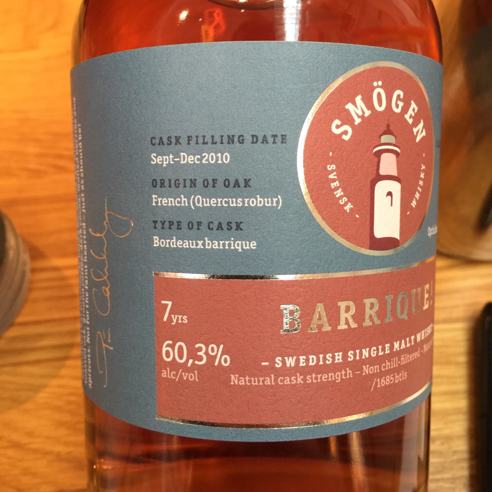 Barrique consists of a vatting of four european (french) barriques (225 litre casks) that has previously matured Bordeaux-wine. The casks used are number 4, 23, 24, and 25. The casks were filled with newmake starting in september 2010 ranging through to december 2010. The whisky was bottled at 60,3% ABV (natural cask strength) on the 8th of january 2018 making the whisky 7 years old. The (officially) oldest whisky from Smögen Distillery so far. The casks gave 1685 bottles out of which 1320 are available via the web launch.