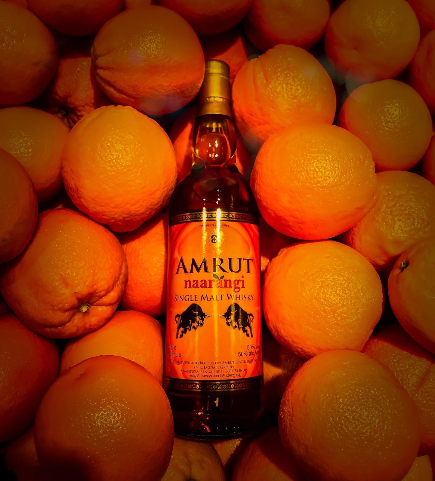 Whiskyn som jag med denna text vill tipsa om har blivit känd som världens första whisky med apelsinsmak och kommer från det indiska destilleriet Amrut i Bangalore. Denna buteljering har fått namnet Naarangi och är likt övrig whisky från Amrut tillverkad på indiskt korn som odlats i Punjab och Rajasthan i nordvästra Indien. Här finner man ett variationsrikt klimat med kalla vintrar och brännheta somrar samt ett strömmande vatten från Himalayas höjder genom floden Sutlej vilket skapar ett unikt och smakrikt korn. Efter skörd låter man kornet mältas på mälteri i Jaipur och Dehli innan det transporteras till destilleriet i södra Indien, närmare bestämt Bangalore. På destilleriet sker såväl destillering som lagring och tack vare det geografiska läget med tropiskt klimat finner man kanske här dem gladaste änglarna i världen i och med den intensiva mognadsprocessen som får whiskyn att dunsta med rasande fart.