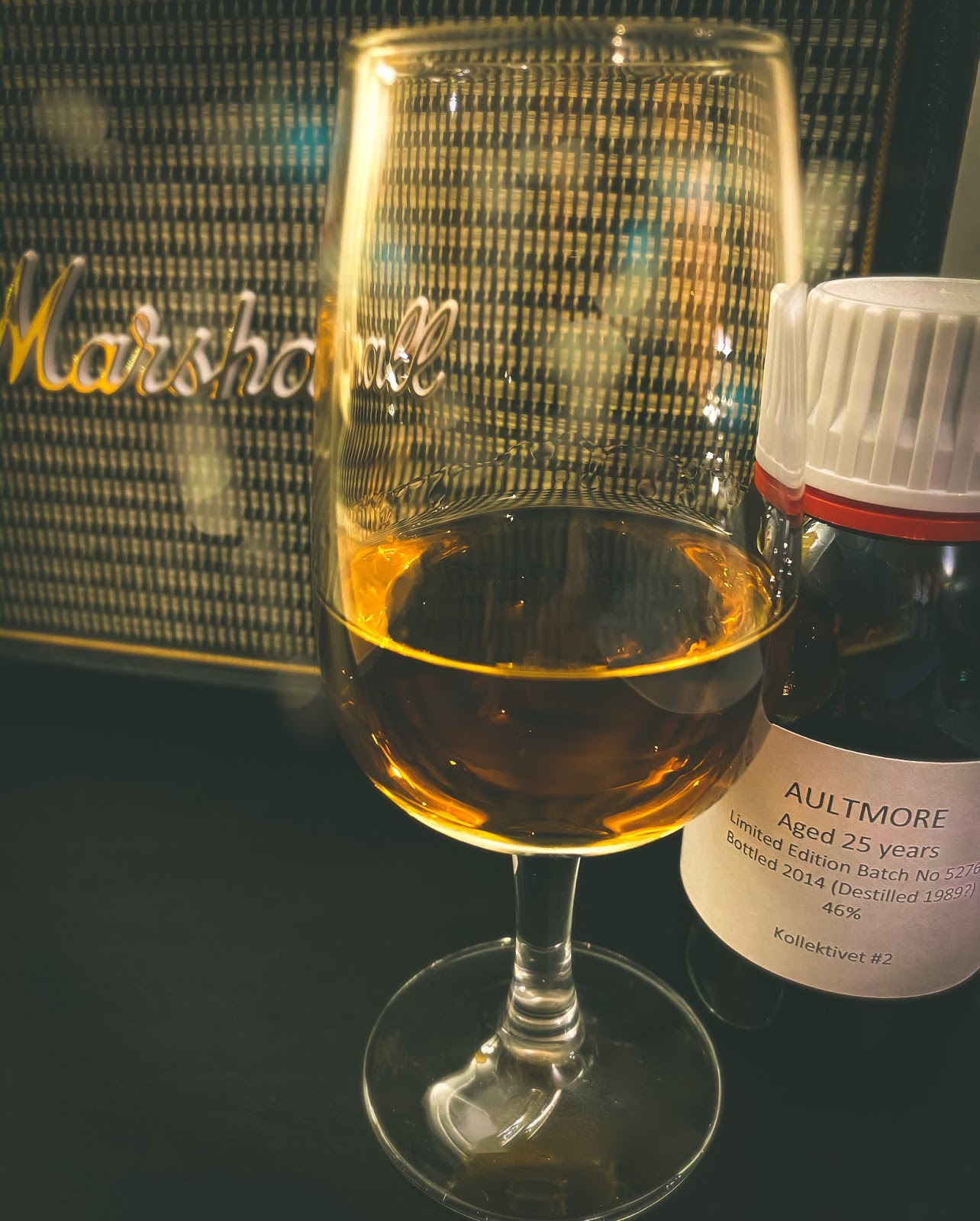 En av dessa buteljeringar har jag nyligen haft möjlighet att njuta av och som jag har njutit! Aultmore 25 yo 46%, är en limiterad utgåva som dessvärre inte går att finna på Systembolaget. Dock går det att investera i en flaska om man är på resande fot eller beställer från utlandet. Här är mina doft och smaknoteringar av denna läckerhet som i detta fall kommer från batch 5276.