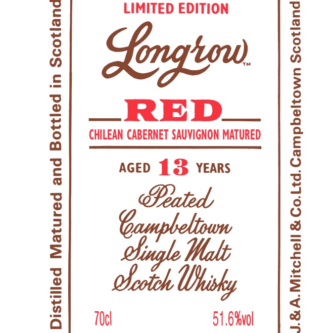 Longrow Red 13yo (50-55ppm) has initially spent 10 years on a mix of bourbon barrels and refill sherry hogsheads (ratio not stated), and has after that enjoyed 3 years of "finishing" in casks that previously matured Cabernet Sauvignon from the Chilean Mont Gras' Intrigue Estate (located in Alto Maipo). The ABV is 51,6% and Sweden receives 660 bottles out of 9000 in total. Ok folks, lets review!